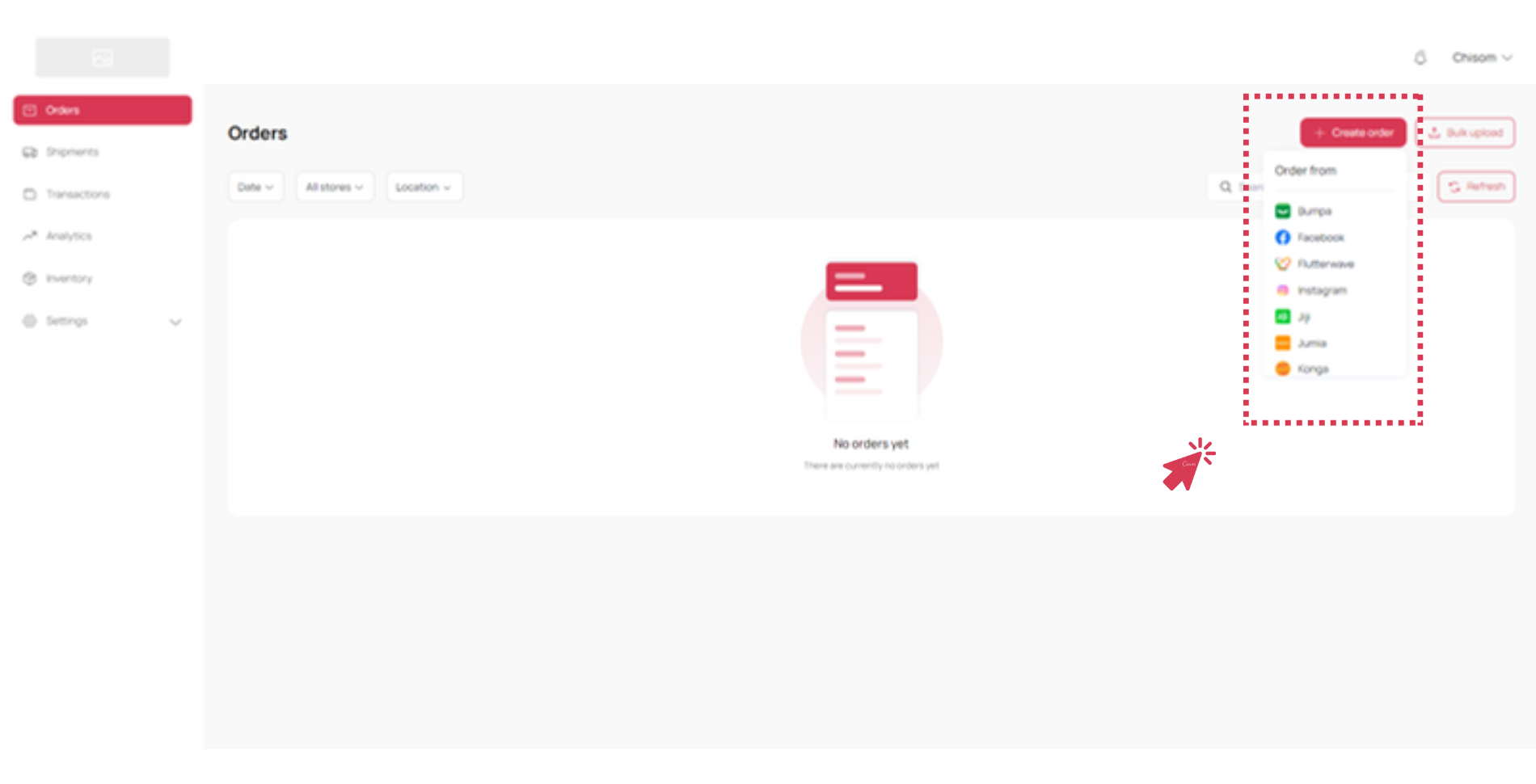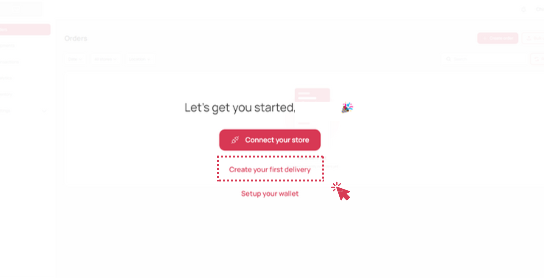 - You can click on ‘Create your first delivery’ on your dashboard. You can also go to the menu on the side to click on ‘Orders’ and then ‘Create order’. Select where your order came from to proceed.