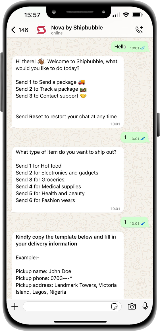 Nova is Nigeria's first multiple-delivery-option Whatsapp AI chatbot that simplifies the process of booking deliveries. With Nova, you can book deliveries directly on WhatsApp without going through the whole process of creating an account or logging in. You can create shipments and process deliveries in minutes by just texting ‘Hello’ to 07070881487 or via this link and Nova handles the rest.